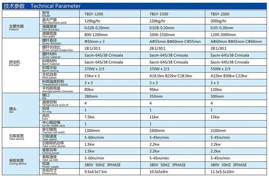 吹制各種規格的低密度聚乙烯、高密度聚乙烯和線性低密度聚乙烯塑料薄膜,廣泛應用于食品百貨、日用、化工、針紡品、購物禮袋和工業包裝,機筒、螺桿采用38CrMoAl合金材料經氮化處理精密加工而成,具有很好的耐磨和耐腐蝕性。