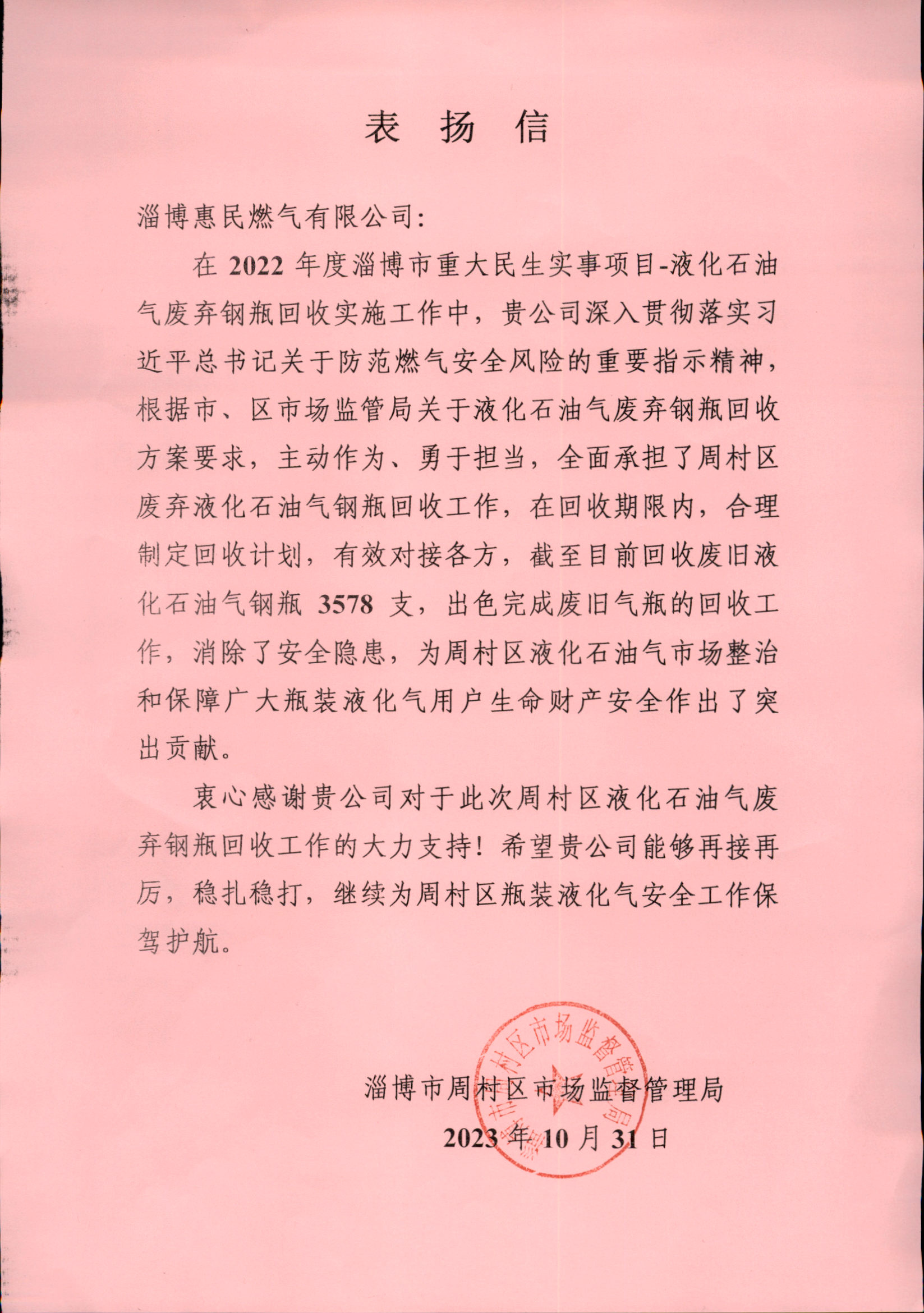 11月27日,淄博市周村區市場監督管理局專程到淄博惠民燃氣有限公司送去表揚信,對惠民燃氣在全省市場監管系統城鎮燃氣安全專項整治工作推進現場會和作為全市重大民生實事項目的液化石油氣廢棄鋼瓶回收工作中作出的突出貢獻表示感謝,并充分肯定了惠民燃氣在液化石油氣行業中的引領示范作用。
